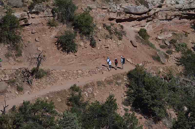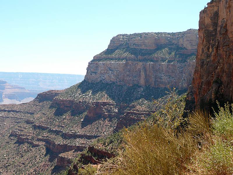 Leider hat es mit dem guten Schlafen nicht wirklich geklappt. Beide Nächte im Holiday Inn waren geprägt von der Eismaschine, die sich gefühlt neben unserem Bett befand. So zwischen ein Uhr und vier Uhr nachts sprang sie an und wir standen in unseren Betten. In der ersten Nacht dachten wir schon, es wäre ein Feueralarm oder ein Presslufthammer, so laut war das. Aber das schien von den Bediensteten wohl keinen zu kratzen, offensichtlich lebt man sehr gut von total überhöhten Hotelpreisen. Trotzdem wir nicht wirklich ausgeschlafen waren, ging es nach einem zeitigen Frühstück im Hotel bepackt mit einigen Litern Wasser zum Grand Canyon. Wir wollten auf dem Bright Angel Trail wenigstens zum 1. Resthouse gelangen, um einen neuen Einblick in die Landschaft zu erhalten.