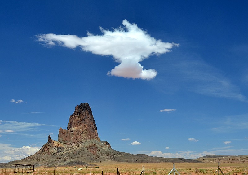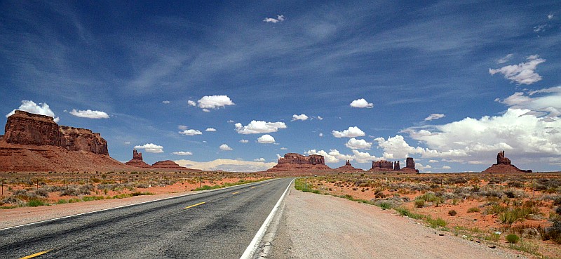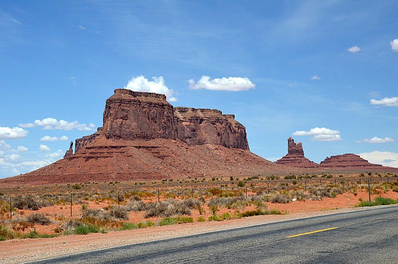 Nach vielen ereignislosen Meilen durch die Wüste, sahen wir endlich rechts von uns die beeindruckenden Felsen in der Nähe des Monument Valley, allerdings auch links von uns ein Gewitter. Wir legten einige Fotostops ein, um den zum Teil dramatischen Himmel und die riesigen Felsen aufzunehmen. Da wir bis Moab noch einige Meilen vor uns hatten, haben wir auf eine Fahrt ins Monument Valley verzichtet.