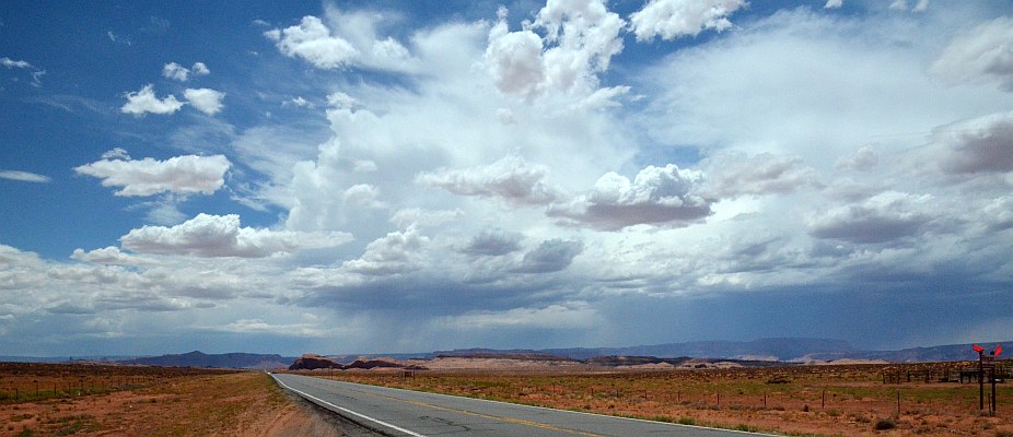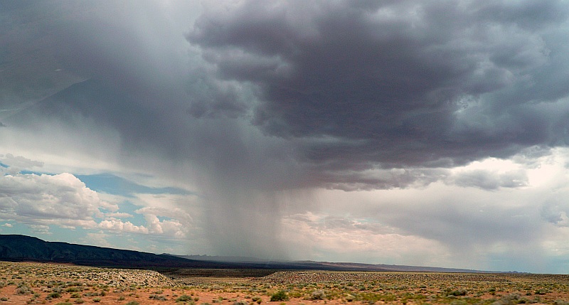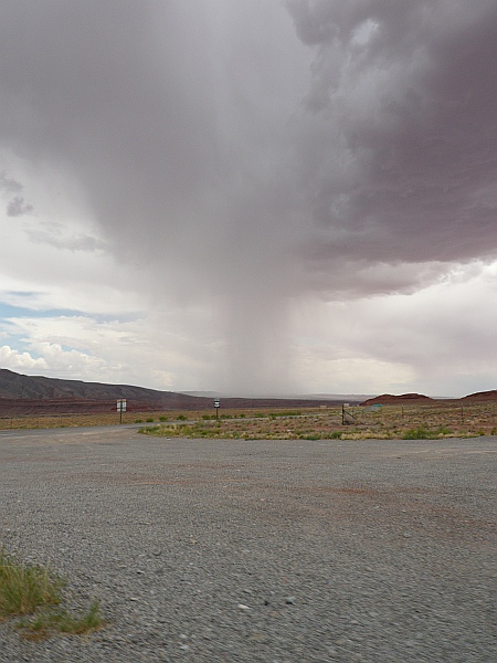 Wir verließen das ungeliebte Hotel früh am Morgen und machten uns auf die lange Fahrt nach Moab. Zuvor haben wir – wie jeden Morgen – die Kühlbox erneut mit Eis aus der vermaledeiten Eismaschine aufgefüllt. Dafür war sie natürlich gut. Unser Weg führte uns zunächst am Little Colorado River entlang. Dabei hatten wir ein Gewitter hinter uns - gut dass wir gestern im Grand Canyon waren!