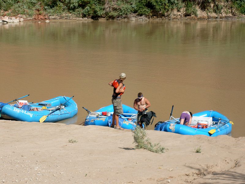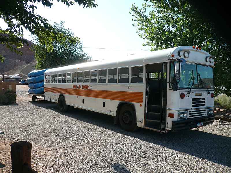 Voller Tatendrang ging es nach dem besten Hotelfrühstück der ganzen Reise – die Auswahl war wirklich groß – zum Veranstalter „Tag-A-Long“, um eine Floßfahrt (bereits von zu Hause gebucht als Rafting) auf dem Colorado River anzutreten. Vor dem Office versammelte sich nach und nach eine bunt gemischte Truppe von „Abenteuerlustigen“. Mit von der Partie waren eine französische Familie, andere Deutsche, drei Holländerinnen und Amerikaner. Vermutlich waren auch noch andere Nationalitäten dabei, wir können uns nicht mehr genau erinnern. Die Schwimmwesten mussten wir sofort angelegen. Dabei machten sich die Mitarbeiter den einen oder anderen Spaß mit uns. Inge bekam zum Beispiel eine viel zu eng eingestellte Weste mit den Worten: „Breathe in“, angepasst. Dazu fiel ihr nur noch ein leicht verzweifeltes: „But I can`t breathe in for 3 hours“ ein. Die Klettverschlüsse waren zum Glück schnell gelöst und natürliches Atmen war wieder möglich. Die Versammlung von etwa 30 Personen in Schwimmwesten direkt an der Hauptstraße in Moab sah schon irgendwie lustig aus. Kurze Zeit später ging es mit einem sehr gut klimatisierten Bus (im Sommer heiß, im Winter kalt) ca. 20 Meilen bis zum Startpunkt am Fluss.