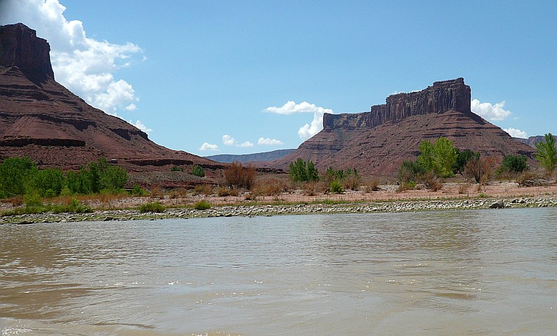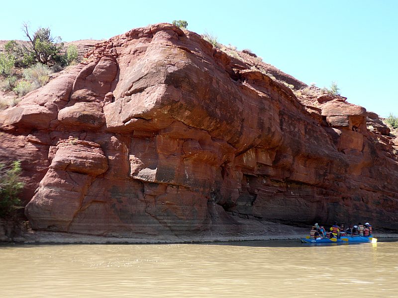 Dort wurden wir auf drei Schlauchboote verteilt, um dann bis zum Mittag auf dem Colorado zu „raften“. Bedingt durch den niedrigen Wasserstand war es eher eine gemütliche Flussfahrt, dafür gewährte sie andere Einblicke in die Landschaft um Moab und es gab keine Mücken.