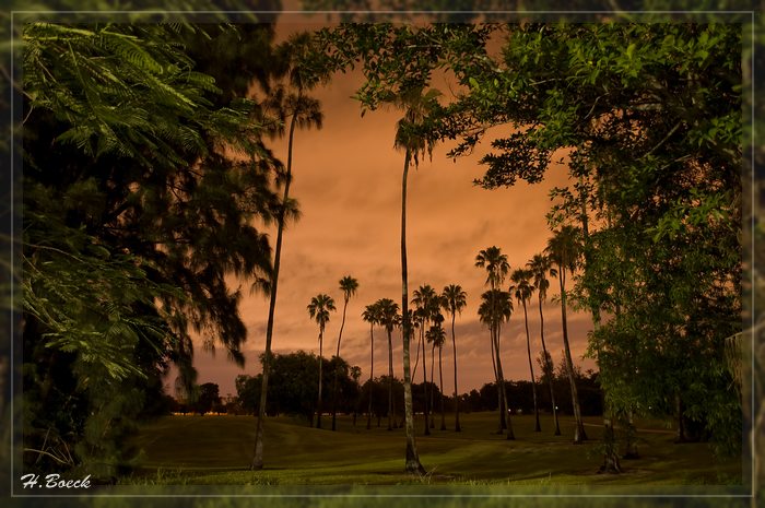 Ich blickte kurz aus dem Fenster und wenig später stand ich mit Kamera und Stativ hinter dem Hotel. Ein Golfplatz, direkt am Hotel, gab eine nette Kulisse ab. Der Himmel hatte eine tolle Färbung angenommen, es sah richtig dramatisch aus. Mit dem Licht vom Hotelparkplatz im Rücken nahm ich einige dramatisch anmutende Fotos auf.