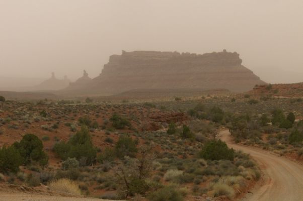 Es geht nun durch das Monument Valley, wo immer noch ganz ordentlich Sandsturm herrscht und wieder vorbei am Valley of the Gods den Moki Dugway hoch. Bald ist die Cigarette Springs Road erreicht, an der wir abbiegen. Die Straße ist ganz o.k., nach einer Meile müssen wir 4 Bucks an der Self-pay Station zahlen. Dank Steffen Synnatschke's genauer Beschreibung finden wir den Parkplatz ohne Probleme. Allerdings schlagen wir uns danach 20 Meter neben dem eigentlichen Trailhead in den Wald