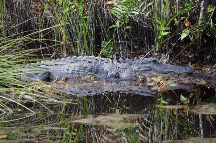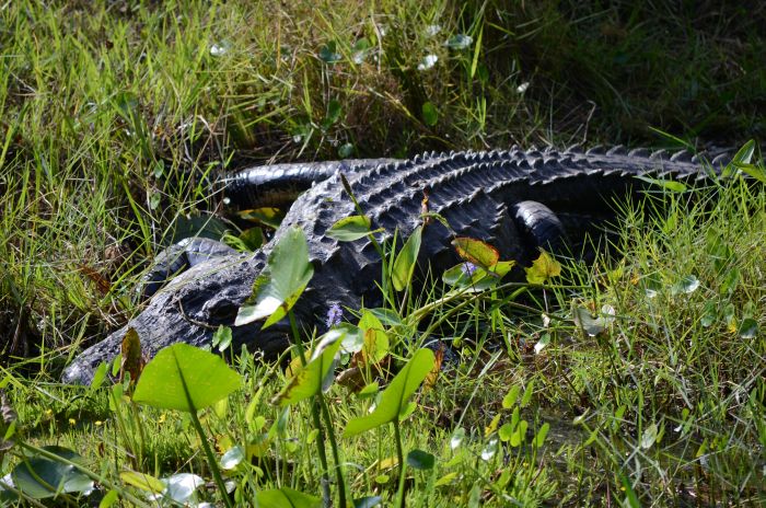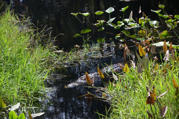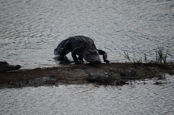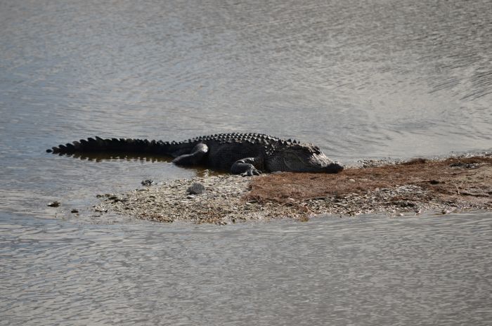 Im Park selber machen wir zuerst eine launige Bootsfahrt durch den Swamp, bei der wir einige Alligatoren und auch einen Baby-Alligator zu sehen bekommen. Wieder zurück an Land gehen wir zum Nature Center, wo eine nächste Infoveranstaltung stattfinden soll. Auf dem Weg dorthin döst ein gewaltiger Alligator in der Nähe des Weges – irgendwie beunruhigend – außerdem kreisen mächtige Geier über unseren Köpfen.