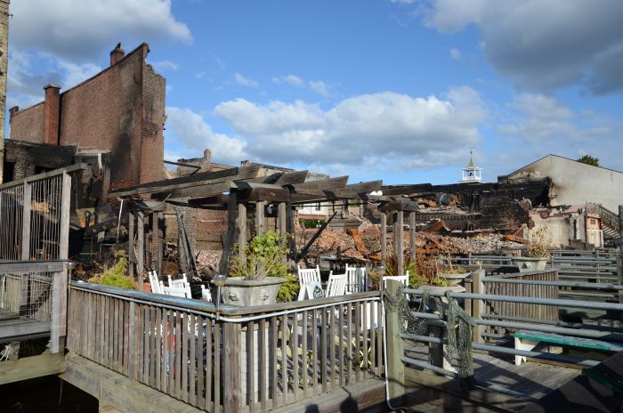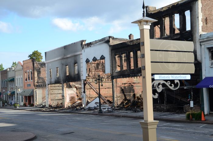 Den letzten Stopp legen wir dann noch in Georgetown ein, ebenfalls ein nettes kleines Südstaaten – Städtchen. Auch hier gibt es einen Boardwalk am Wasser entlang und als besondere „Attraktion“ insgesamt acht total verbrannte oder beschädigte Gebäude mitten im historischen Stadtkern. Es riecht noch verbrannt, denn das Feuer ist gerade mal drei Tage her und es ist sehr schade um die historische Bausubstanz.