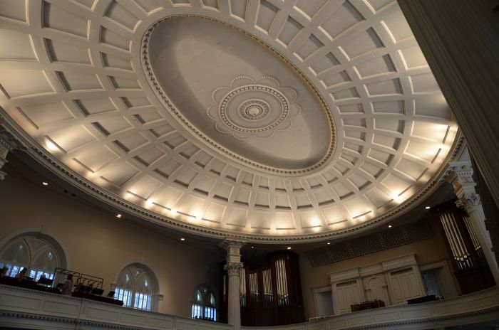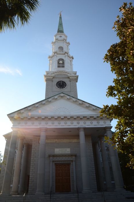 Nach dem Lunch sehen wir uns noch das Owens-Thomas House an und die Führung entschädigt, denn sie war deutlich besser gemacht und das Haus gab auch deutlich mehr her. Vom erst 24jährenden Engländer William Jay gestaltet, vereint es mehrere klassische Baustile und überrascht mit manch tollen Extras wie einer Brücke im Treppenhaus. Außerdem war das Haus mit mehreren Zisternen und Toiletten mit Spülung (bevor das Weiße Haus welche hatte) hochmodern ausgestattet. Auf dem Rückweg kommen wir dann noch an der First Prysbeterian Church vorbei und machen Fotos von der Außenseite, als uns eine Frau anspricht, dass sie gerade zur Chorprobe geht und ob wir die Kirche von innen sehen wollen. Natürlich wollen wir, sie nimmt uns kurzerhand mit hinein und erzählt uns noch ein paar Details und verärgert die Chorleiterin, die gerne anfangen möchte „I must give this tour, they’re from Germany!“ Die Kirche sieht von innen toll aus.