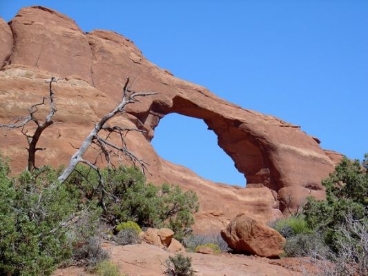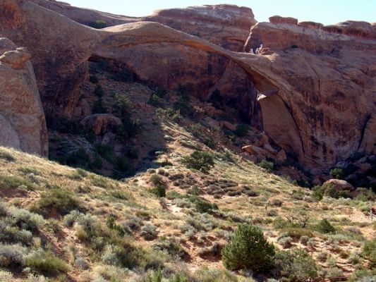 Nachdem wir uns gründlich im neueröffneten und wirklich schönen Visitor-Center umgeschaut haben, fahren wir direkt zum letzten Trailhead, dem Devils Garden. Dort laufen wir den Trail zum Landscape-Arch und machen unterwegs die kurzen Abstecher zum Pine- und zum Tunnel-Arch. Der Weg ist sehr schön und der Knieoperierte kann ihn auch problemlos laufen.