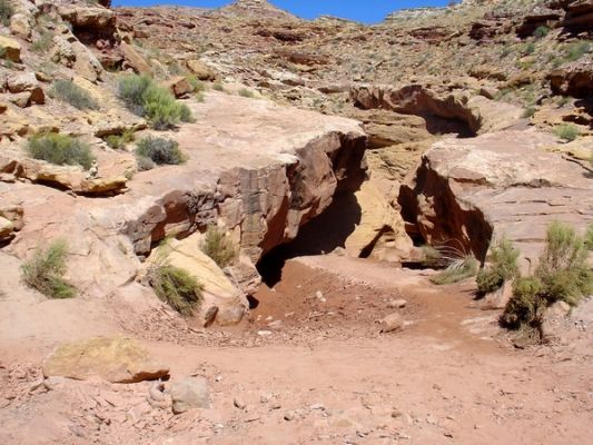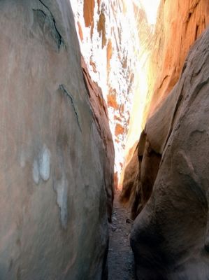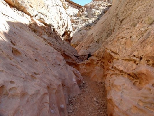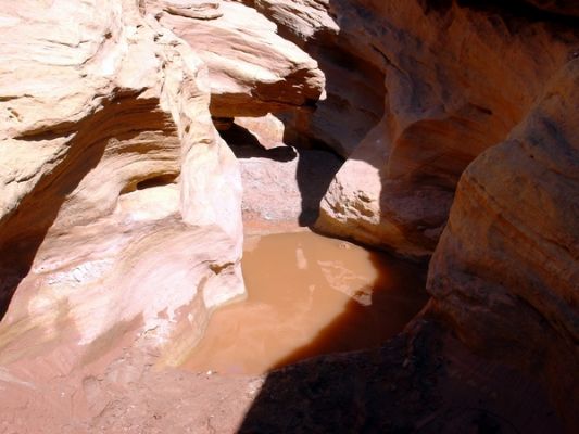 Die Fahrt über die I70 und die 124 ist recht unspektakulär. Kurz vor Hanksville biegen wir dann vom Highway ab zu unserem ersten Ziel, dem Little Wild Horse Canyon. Die Anfahrt über eine Dirtroad ist recht gut und bei guten Bedingungen sicherlich auch mit einem normalen PKW fahrbar. Am Parkplatz stehen bereits vier andere Wagen, worüber wie doch etwas überrascht sind. Nach 10 minütigem Fußweg stehen wir am Eingang zum Slotcanyon. Hier treffen wir auf ein amerikanisches Paar, daß wohl schon seit einiger Zeit nach einem machbaren Einstieg gesucht hat und nun aufgibt und umkehrt. Die für die beiden unüberwindlichen Hindernisse sind zwei große Pfützen und ein ca. 2 Meter hoher Felsbrocken.