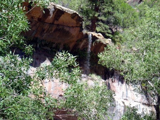Am Trailhead zu den Lower Emerald Pools steigen wir aus und laufen mit Unmengen anderer Besucher den Trail zu den Fällen. Wie gut, daß am Ziel ein schönes Bild der Fälle aufgestellt ist, da die Fälle... naja, seht selber...
