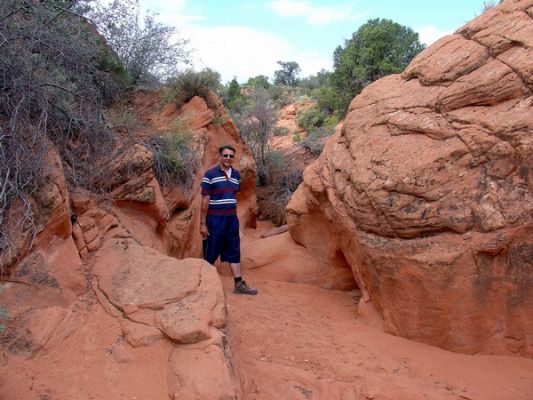 Wichtiger auch als diese eine Niederlage ist der Zustand von Jürgens Knie, der jetzt auch weitere Unternehmungen gefährdet. Nach mühsamem, durch etliche Pausen unterbrochenem Rückweg kommen wir endlich am Parkplatz an. Dort treffen wir noch ein weiteres deutsches Pärchen, das , unter einem kleinen Schirmchen versteckt, unschlüssig ist, ob es den Weg zur Wave überhaupt antreten soll. Inzwischen wissen wir, daß es sich bei den beiden um die Forianer Nicole und Cairbre handelt, deren Reisebericht "7 Wochen kreuz und quer durch die USA" auch hier im Forum zu lesen ist. Trotz Frust und Enttäuschung hat der Gedanke an den Naturtrip der beiden unter einem kleinen Schirmchen bei uns zur einzigen Erheiterung des Tages geführt. "Sorry, Ihr beiden, wir freuen uns aber sehr, heute lesen zu können, daß Euer Wave-Tag zu einem tollen Erlebnis geworden ist. Eure Fotos sind wunderschön,