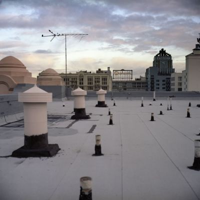 Wieder im Hotel nutze ich eine Trockenphase, um ein paar Bilder vom Dach aus zu machen. Das Abendrot gibt einen manierlichen Hintergrund für die Skyline ab. Und dann schließlich mache ich Bild Nr. 12 auf Film Nr. 60... basta, finito, over and out!