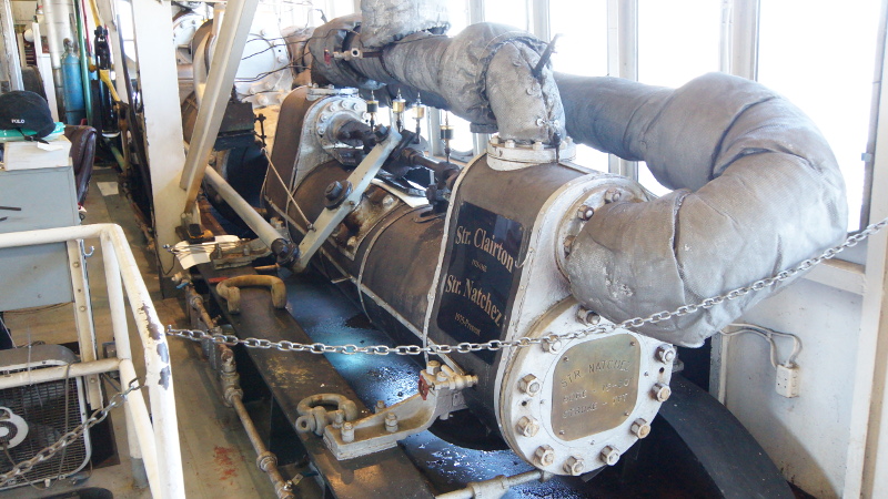 Es war auf Deck zum Glück nicht so voll, vielleicht lag es daran, dass einige den Lunch mitbestellt hatten. Das Wetter war wie gesagt top und mit etwas Verspätung ging es dann los. Und es hat sich vollkommen gelohnt, die Fahrt war kurzweilig, eine Dixie Band spielte im Salon auf (wurde auch auf Deck über Lautsprecher übertragen) und zeitweise erzählte ein Sprecher etwas zum Schiff, zu dem was man gerade am Mississippi sah oder zur Geschichte des Mississippi. Der Pegelstand ist zurzeit übrigens sehr, sehr hoch, wohl nur noch 2 Fuß bis zum Scheitelpunkt. Die Natchez ist übrigens neben einem weiteren Schiff in St. Louis das einzige dampfbetriebene Schiff in den USA. Den Maschinenraum konnte man auch besichtigen, was ich mir natürlich nicht entgehen lassen wollte.