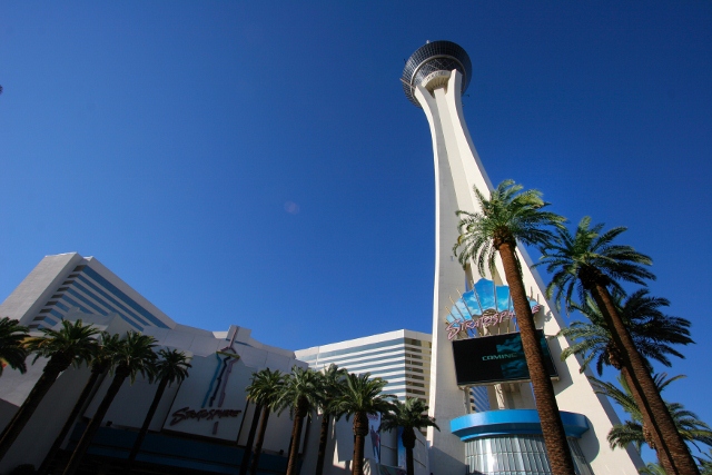 Endlich kommt Las Vegas in Sicht. Leider entschließt sich unser Busfahrer nicht über den Strip zu unserem Hotel zu fahren. Ok da ist immer viel Verkehr aber Vegas ist auch bei Tag sehenswert. Gut, geht’s also hinten rum bis zum Stratosphere Tower der ziemlich am Ende des Strips liegt. Eric bietet eine abendliche Tour durch Vegas an. Wir entscheiden uns aber dagegen das mitzumachen. Schließlich war ich ja schon mal in Vegas und ich stelle es mir nicht gerade berauschend vor durch das Gedränge der tausenden von Leuten die Abends unterwegs sind einer Gruppe zu folgen. Wir machen unser eigenes Ding.