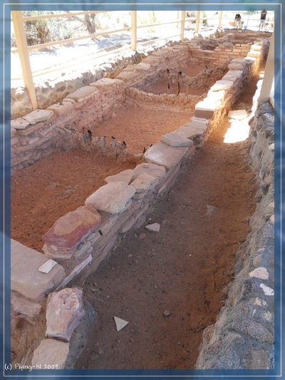 Village State Park" zu besichtigen, welcher aus einem kleinen Museum mit gift shop und einer Ausgrabungsstelle mit Ruinen besteht. Ein Lehm-Gebäude wurde rekonstruiert, damit man sich ein besseres Bild machen konnte, wie die Anasazi gelebt haben. Dort wo das eigentliche Anasazi-Dorf vor ca. 800 Jahren war, gab es nur die Fundamente/Mauerreste zusehen. Im Museum gab es sozusagen den "Theorie-Teil" über die Indianer, mit Geschichte, Geologie, Waffen und ein Kapitel über die Räuber und Zerstörer solcher archäologischen Stätten... Familien-Eintritt kostete 10$, das fand ich angemessen.