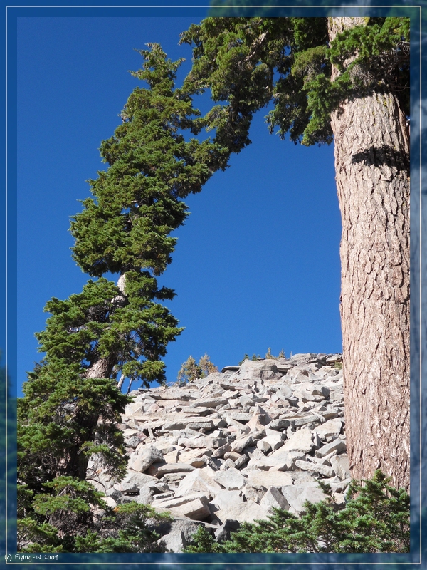„Flatiron Tree“ (umgefallener Baum mit außergewöhnlicher Form). Der Wald ist hier wesentlich dichter als