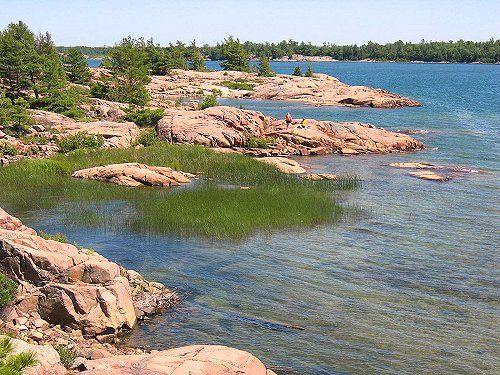 Der Weg ist mit roten Markierungen auf den Steinplatten markiert – den ein Weg ist auf nacktem Stein natürlich nicht zu erkennen. Es geht ständig über Felsbrocken – rauf und runter. Nach etwa 15-20 Minuten ist die erste Aussichtsmöglichkeit auf die Georgian Bay werreicht – wenn auch noch etwas entfernt. Dann kommt es Schlag auf Schlag – um so weiter die roten Markierungen in Richtung Küste führen und so traumhafter werden die Ausblicke auf die Bucht in der sich viele kleine rosa-orangen Felsinseln gegen den in der Sonne schimmernden See abheben.