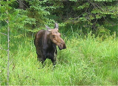 Danach geht es auf der Parkstraße wieder nach Westen. Am Straßenrand stehen 2 Autos und die Leute sind ausgestiegen und sehen in Richtung Waldrand. Klar da gibt's wahrscheinlich einen Elch zu sehen - also ebenfalls rechts ran gefahren und selbst mal ins Unterholz gespäht - und tatsächlich steht eine Elchkuh gemütlich kauend nur wenige Meter von uns entfernt im Gras. Also wieder zum Chevy zurück und die Filmausrüstung vorsichtig in Anschlag gebracht. Nachdem einige Aufnahmen im Kasten sind - will ich noch schnell zwei Fotos machen bevor Frau Elch wieder Land gewinnt. Ausgerechnet jetzt ist der Akku des Fotos leer.