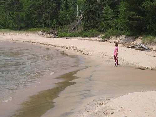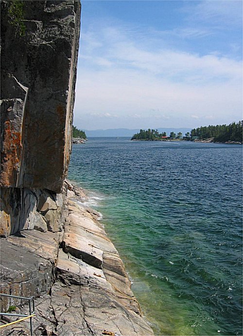 Unten angekommen gelangt man zum Einstieg auf die letzten 30-40 Meter – wobei dieses kurze Wegstück von den wenigsten begangen wird – je nach Seegang. Dieses letzte Stück führt an einer steilen Felswand entlang, an der man Petroglyph’s (Felszeichnungen) der Agawa-Indianer finden kann.