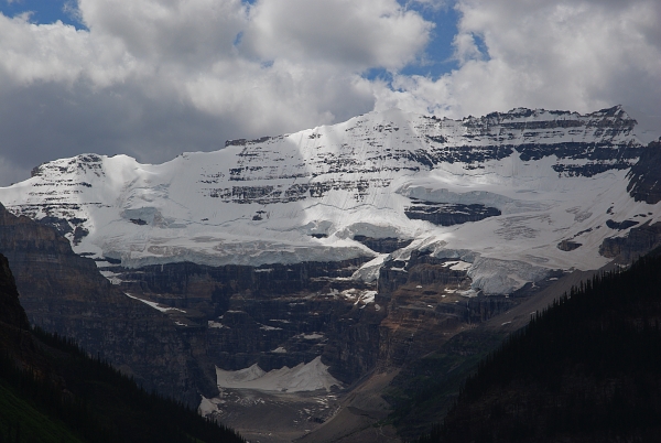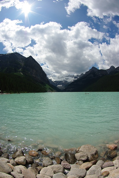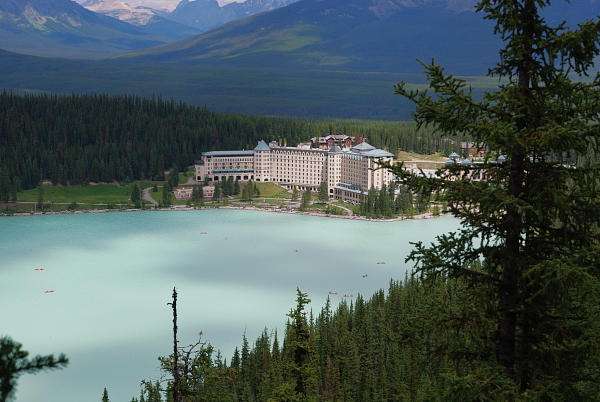 Am Ausgangspunkt zurück möchten wir noch rauf zum Aussichtspunkt, der ist aber leider gesperrt. Wir fahren weiter zum Lake Louise und treffen dort auf Unmassen an Menschen, wir kurven zigmal, um einen Parkplatz zu ergattern. Um den vielen Menschen zu entrinnen, machen wir uns auf den Weg links rauf zum Fairview Lookout. Der Weg ist sehr steil, sehr anstrengend, aber am Ende werden wir belohnt mit einem schönen Blick auf See und Fairmont-Hotel.