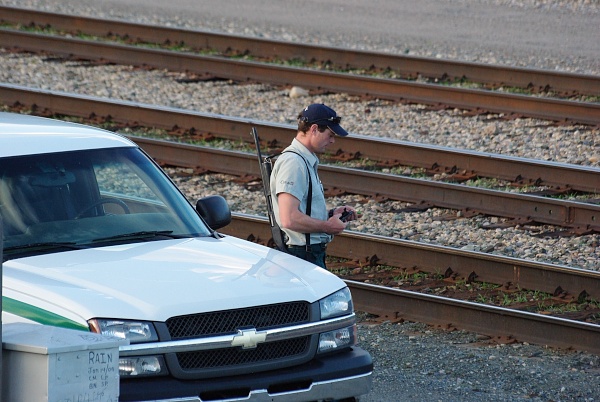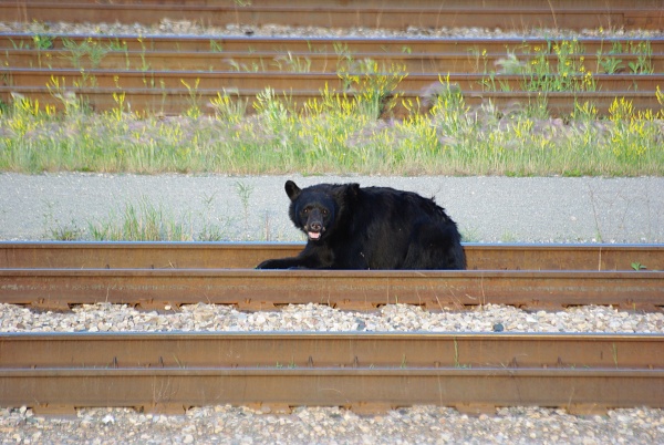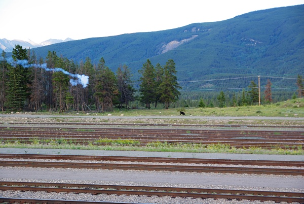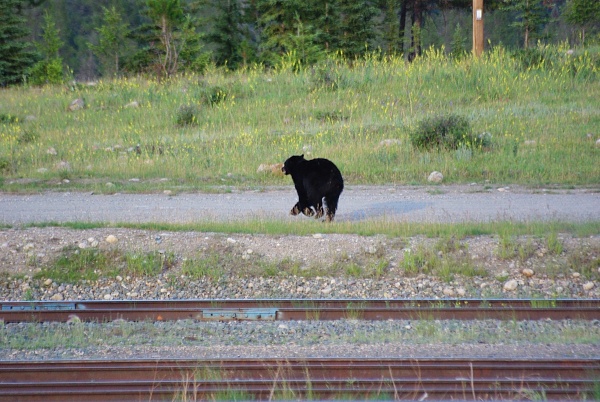 Wir packen alle Sachen in Ruhe aus und fahren zum Essen in die Stadt, danach in den Supermarkt und Liquor-Store – dort will man für drei Dosen Bier über 30CAD! Dass Alkohol in Kanada SO teuer ist, war mir nicht klar und zum Glück stellt sich der Preis dann auch als Irrtum heraus und wir bezahlen „nur“ 6 CAD. Auf dem Weg zurück zu Pines sehen wir am Bahndamm einige fotografierende Menschen - und einen Bären !!! Der Bär liegt zwischen den Gleisen und lässt sich auch von der immer größer werdenden Menschenmenge nicht wirklich irritieren.