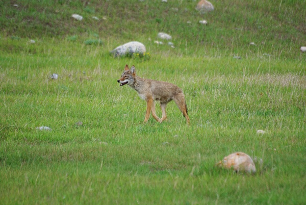Heute schlafen wir mal länger, ist ja Urlaub! Es gibt ein gemütliches Frühstück auf dem Balkon. Danach fahren wir zum Fotostopp an den Patricia Lake, anschließend eigentlich zum Baden an den Pyramid Lake. Es bewölkt sich und ist zu kalt, so sitzen wir nur etwas am See und relaxen. Gegen Mittag fahren wir zum Lake Annette, dort ist es schön warm, auch baden ist okay. Volker und ich baden aber nur unsere Füße, Robin schafft es ganz. Es tut richtig gut, mal kein Programm zu haben und einfach nur auszuruhen, nach 2 Stunden fahren wir zu Subway, dann “nach Hause”. Der Mittagsschlaf fällt länger aus als geplant, macht aber nix, wir haben ja Zeit. Eigentlich war eine Gondelfahrt auf  Whistler's Mountain geplant, aber es bewölkt sich recht stark, so gehen Volker und ich noch etwas am Fluss spazieren, anschließend fahren wir zu dritt in den Ort. Kurz hinter der Ausfahrt von den Pine Bungalows begegnet uns ein Koyote (zuerst dachten wir allerdings, es sei ein Wolf), nach einigen Fotos fahren wir nun endlich nach Jasper, bummeln durch die Shops und kaufen mal wieder gar nichts, dann beginnt es heftig zu regnen und wir flüchten in ein Cantonese Restaurant. Lecker das Essen, aber irgendwie auch dreckig der Laden. Das Wetter wechselt nun recht schnell, mal sonnig, mal regnerisch; auf dem Weg zu Pines treffen wir noch auf eine große Deer-Herde. Zurück bei Pines sortieren und packen wir unsere Koffer neu, die letzte Woche ist angebrochen; wir planen den morgigen Tag - mal sehen, wie das Wetter wird - dann geht es ab ins Bett. Passend dazu gibt es kräftigen Regen. Wir hoffen, dass es morgen schön, zumindest trocken sein wird und wir zum Maligne Canyon und Lake fahren können. Achja, und ein Moose fehlt uns auch noch, ja, und ein Wolf wäre auch klasse für's Fotoalbum.