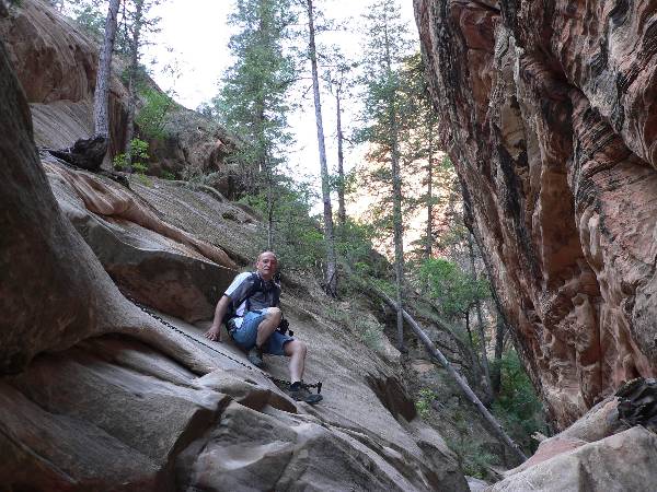 Wir büßen unseren gestrigen Fehler und sind schon um 2.15 h putzmunter. Ich durchstöbere einige Infobroschüren und kann nach ca. einer Stunde wieder einschlafen. Um 5.45 h stehen wir dann endgültig auf, frühstücken in unserem Zimmer und nehmen um 7.10 h den Shuttlebus zum Park. Da wir noch keinen Parkpass haben und die Kasse am Eingang noch nicht geöffnet ist, trinken wir noch einen Kaffee bzw. Tee. Mit dem Shuttle geht es bis zum Weeping Rock, dort wollen wir den ca. 2 Meilen langen Hidden Trail bewältigen. Wir kommen nur langsam voran, da die vielen Aufnahmen unseres „Kameramannes“ Gis Zeit in Anspruch nehmen. Er macht –wie immer- seine Sache gründlich und ist auch nicht so faul wie wir und nimmt das Stativ mit. Ich bin mit dem Fotoapparat „bewaffnet“, Christian hat das Fernglas, durch das er immer wieder in der vergeblichen Hoffnung schaut, ein größeres Tier zu entdecken. Für uns Spaziergänger ist die Wanderung zum Hidden Canyon eine schöne Alternative gegenüber der Besteigung des Angels Landing oder Observations Point.  Nach knapp drei Stunden fahren wir mit dem Shuttle weiter bis zum Tempel of Sinawava, der Endstation der ca.7 Meilen langen Stichstraße. Wir laufen ein bisschen den Riversidewalk entlang, da wir wissen, dass die Narrows nur nach einer glitschigen Partie durch den Fluss zu erreichen sind, drehen wir schon vor dem Ende des geteerten Weges um. Die Sonne brennt ( während des Urlaubs stellte ich fest, dass die Floskel „die Sonne brennt auf uns herab“ für mich nicht nur noch eine so daher gesagte Phrase ist) erbarmungslos und laugt unsere letzten Energiereserven aus. Um 13.45 h sind wir zurück in unserem Motel und faulenzen am und im Pool. Erholt sind wir um 16.30 h wieder im Park und schauen uns im Museum den interessanten Film über den Zion NP an. Anschließend unternehmen wir von der Zion Lodge aus noch einen gemütlichen Spaziergang zu den Lower Emerald Pools. Da es nicht mehr so heiß ist, genießen wir es sehr. Beim Warten auf den Shuttlebus sehen wir an der Zion Lodge in diesem Urlaub die ersten mule deers (Maultierhirsche). Natürlich wird das film- und fototechnisch festgehalten. Nun wird es aber Zeit, uns zu stärken. Wir beschließen, ins Bit & Spur, das mexikanische Kost serviert, zu gehen, da ich einigen Reiseberichten positive Kommentare entnommen habe. Obwohl es schon 20.30 h ist, müssen wir erst auf einen freien Tisch warten. Eine große Unterhaltung ist nicht möglich, da der Geräuschpegel sehr hoch ist. Das Essen schmeckt gut, allerdings lässt Gis seine Burritos noch einmal zurückgehen, da diese kalt sind. Auf dem Rückweg zum Motel wollen wir noch ein paar Lebenszeichen an die Daheimgebliebenen senden, aber das Internetcafé ist schon geschlossen. So liegen wir dann gegen 23.00 h im Bett.
