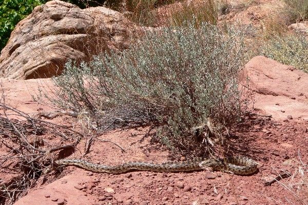 30.05.2006 Calf Creek Falls – Burr Trail – Torrey Heute steht eine Wanderung zu den Calf Creek Falls auf dem Programm. Obwohl wir schon kurz vor 8.30 h loslaufen, ist es schon sehr heiß. Der Weg hat kaum Steigungen, ist aber recht sandig, was die Sache anstrengend macht. Wir lassen uns wie immer viel Zeit, besonders das Gis in Ruhe seine Aufnahmen machen kann und genießen einfach die Landschaft. Es geht mehr oder weniger an einem Fluss entlang, umgeben von Felsmassiven. Es ist sicherlich nichts außergewöhnliches, aber uns gefällt es. Am Anfang des Trails liegen Merkblätter aus, auf denen unterwegs die Botanik erklärt und auf die Felszeichnungen hingewiesen wird. Am Fluss entdecken wir ein paar Truthähne mit Nachwuchs und wenig später auch noch zwei mule deers.