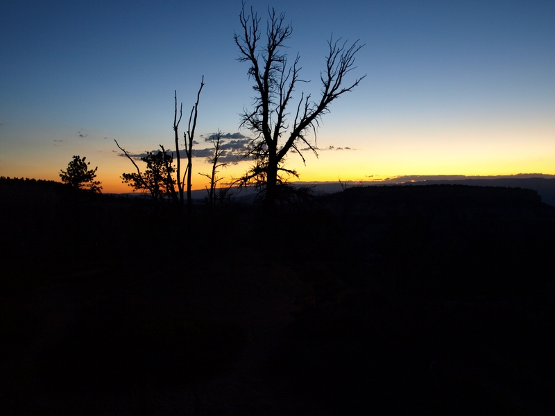 Habe für heute morgen den Wecker gestellt, denn im Gegensatz zu unserer letzten Reise möchte ich doch hier den Sonnenaufgang mitnehmen, und das Wetter scheint ja gut zu sein. Doch niemand will mit, also mache ich mich, mit einem Frappucino in der Hand, und natürlich mit Photoapparat und Stativ, auf den Weg zum Rim. Diesen hat mir der leicht verwirrte Campground-Host gestern abend noch erklärt, und es ist tatsächlich nur ca. 10 Minuten von unserem Standplatz aus.