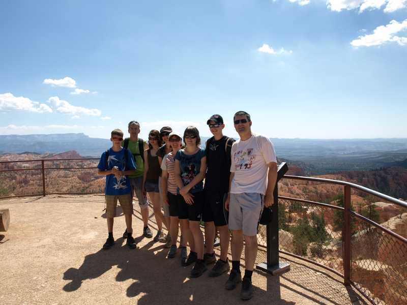 Oben beim Sunrise Point treffen wir eine Schweizer Familie auf ihrer Erst-USA-Reise. Wir tauschen einiges an Erlebnissen aus und ich kann mit ein paar Tipps glänzen. Schliesslich gibts eine kurze gegenseitige Photosession, sodass hier die gesamte Reisetruppe einmal zusammen auf einem Bild ist.