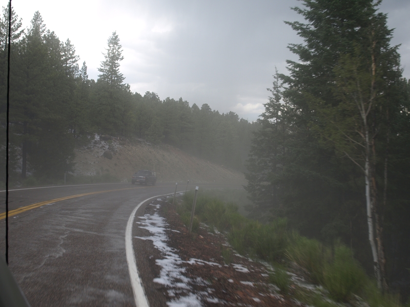 Kurz vor Torrey geraten wir in eine Gewitterregen mit Hagel und Nebel. Einer der ganz wenigen Schlecht-Wetter-Momente unserer Reise.