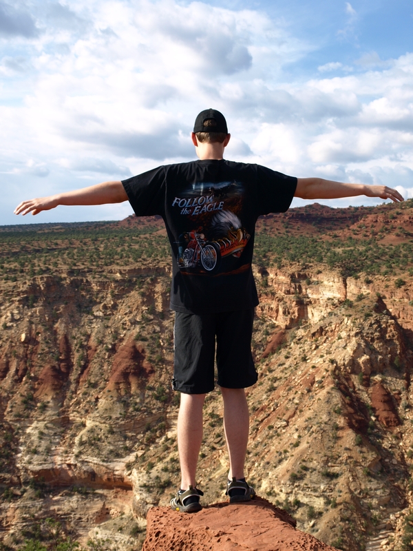 Nach Chimney Rock und Panorama Point gehts zum Goosenecks Overview. Dominik mit passendem T-Shirt...