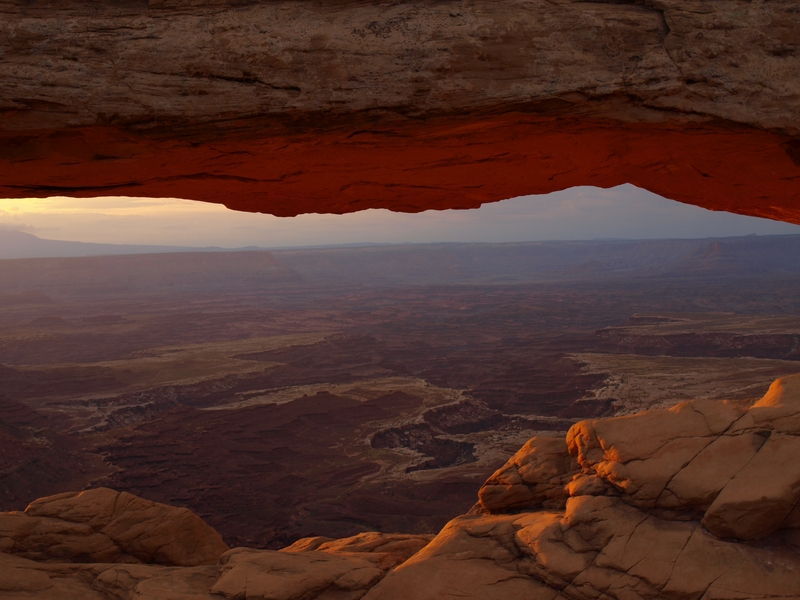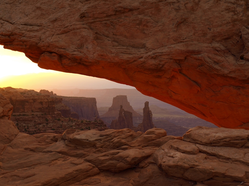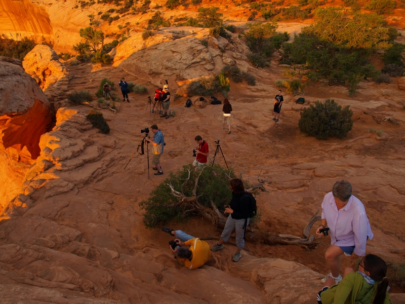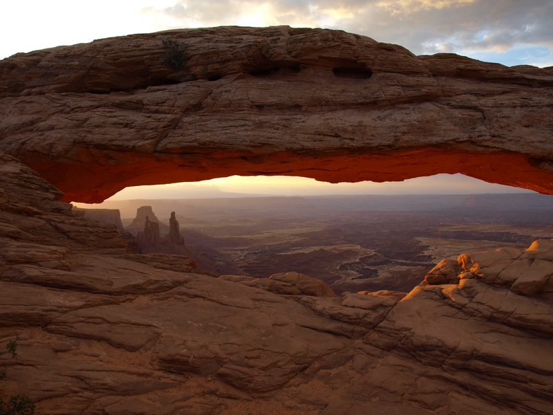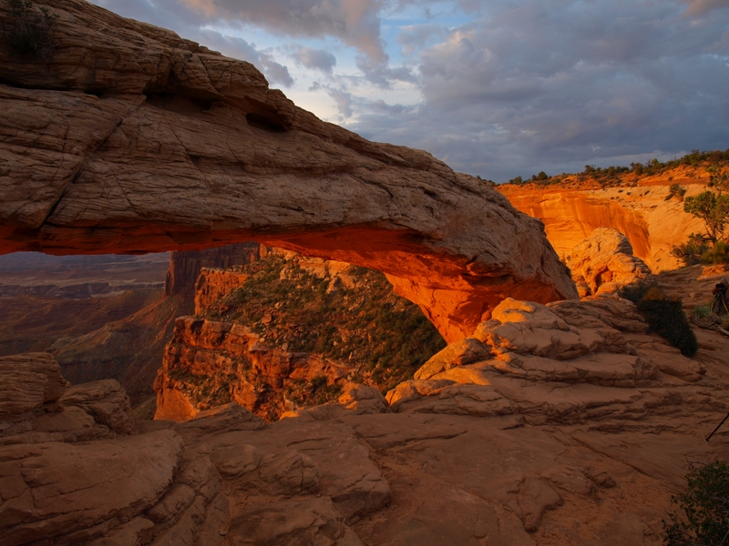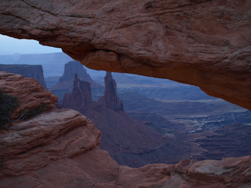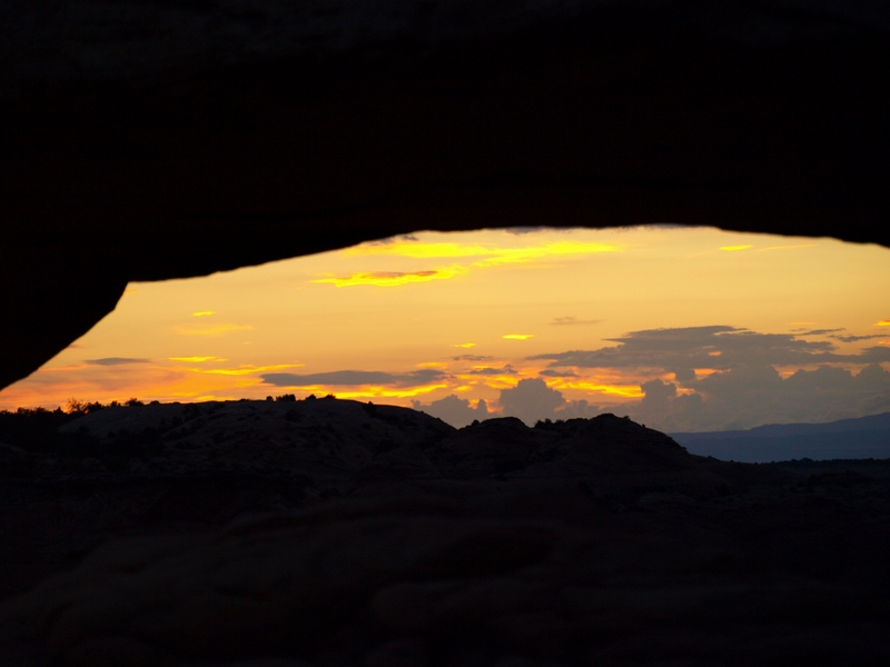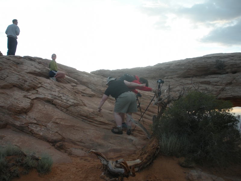 Tagwache bereits um 5 Uhr!!! Ich habe mit Fredu abgemacht, dass wir um fünf nach fünf Kriegsrat halten zwischen dem WoMo's, was das Wetter betrifft. Die ganzen Familien zu wecken und das Wetter spielt nicht mit, wäre ja dämlich. Fredu hat die Lage schon gecheckt und macht das WoMo abfahrtbereit. Wir fahren heute morgen zum Mesa Arch. Die Fahrzeit ist etwa 35 Minuten, und es kommt einem schon komisch vor, so ohne Strassenlaternen durch die Nacht zu düsen. Beim Parkplatz haben sich bisher erst 3 Autos eingefunden, und wir marschieren durch die langsam aufkommende Dämmerung in Richtung Mesa Arch.
