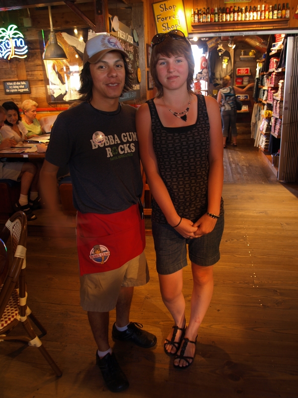 Danach ist unser Tisch freigeworden. Wir geniessen dreimal sehr leckere Shrimps verschiedener Zubereitungsart (und Dominik noch einen Hamburger), sowie die sehr fröhliche, freundliche und unterhaltsame Bedienung: