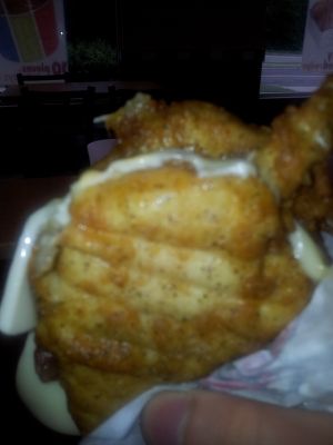 Das ist der KFC Double Down, bestehend aus 2 panierten Chicken-Filets als Brötchenersatz, Käse und Bacon dazwischen, garniert mit einer Sauce.