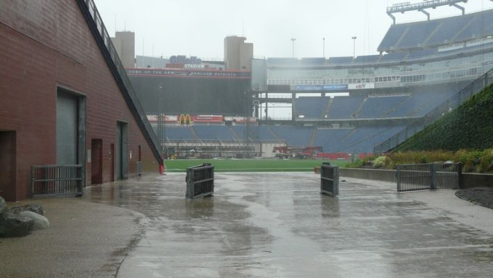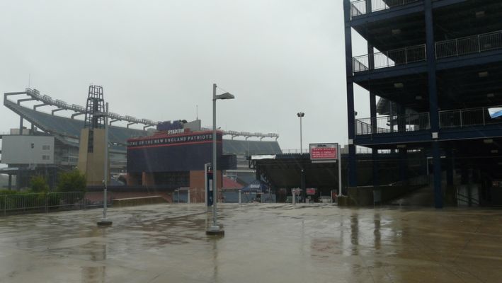 Nach dem Frühstück wurden wir wieder nass auf dem Weg zum Auto, zum Glück zeigte das Navi an, dass Foxborough nicht mehr weit ist, und tatsächlich waren wir innerhalb von 10 Minuten in Foxborough, genauergesagt am 1 Patriot Place.