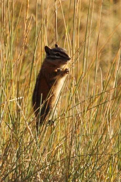 Im Loslaufen sehe ich dann nochwas, was ich auf der Reise noch nicht gesehen habe ... ein Chipmunk ist ja nichts besonderes, aber dieses hier klettert mit den kleinen Füßchen auf die Grashalme, um oben die Samen zu essen.