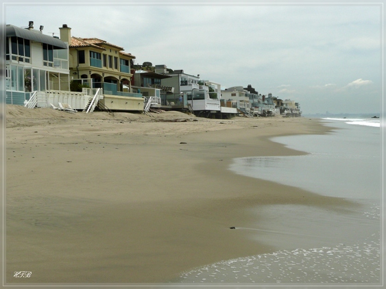 Wir wollen heute einen kleinen Strandspaziergang machen und uns bei dieser Gelegenheit mal diese millionenteuren Strandhäuschen, die die Küste säumen von vorne anschauen. Zum Pacific Coast Highway hin bilden diese ja eine mehr oder weniger durchgehende Mauer und welch Prunk sich in der Frontansicht dahinter verbirgt kennt man fast nur von Fotos. Der Strand vor den Häusern ist private property, allerdings nur bis zur High Tide Line. Der nasse Sand gehört dem Volk und hier darf man sich bewegen. Es gibt einige - meist recht versteckte - „Public Coastal Access“ –Zugänge, die man benutzen muss, um zum feuchten Sand zu gelangen (