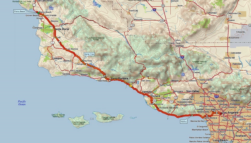 Vorbei am Lake Cachuma führt uns der Highway 154 durch den Los Padres National Forest Richtung Santa Barbara, auf das man von hier oben einen sehr schönen Blick hat. Die Stadt kennen wir schon und so fahren wir ohne weiteren Stopp weiter auf den Highway 1 bis zum Welcome-Schild von Malibu, dass uns nun „27 Miles of Scenic Beauty“ verspricht. Die Parkplätze an den Stränden füllen sich allmählich, es ist schließlich auch Memorial Day-Weekend.