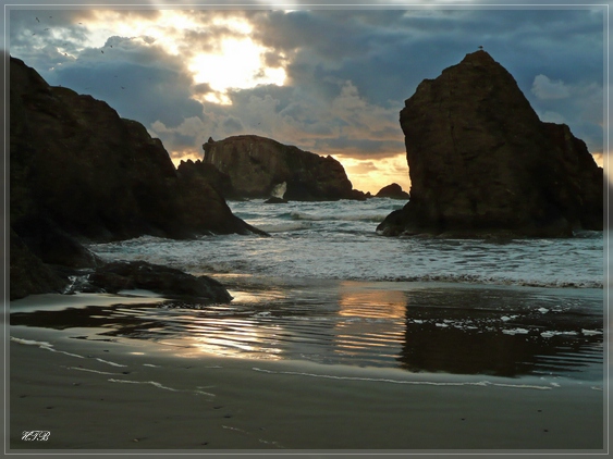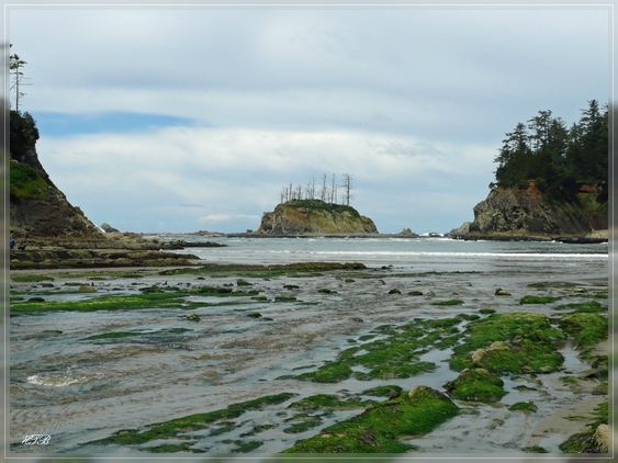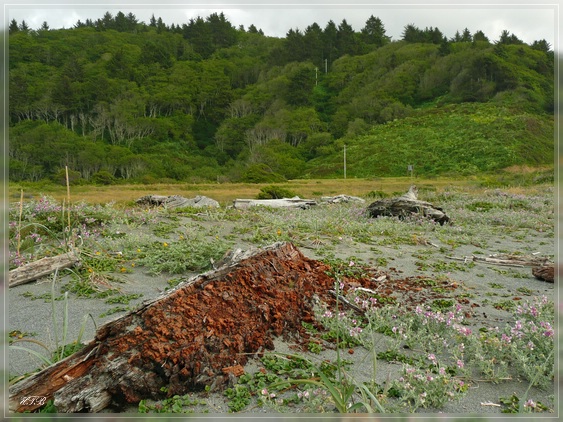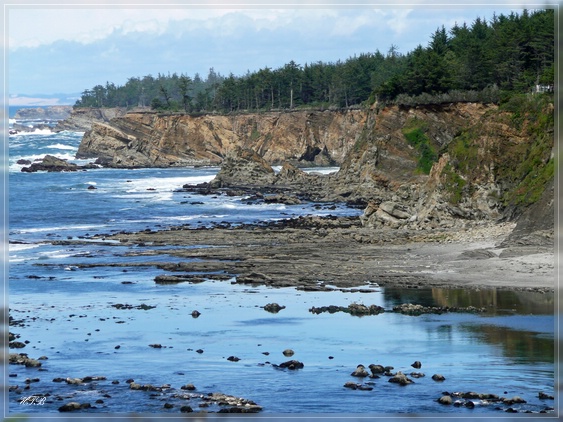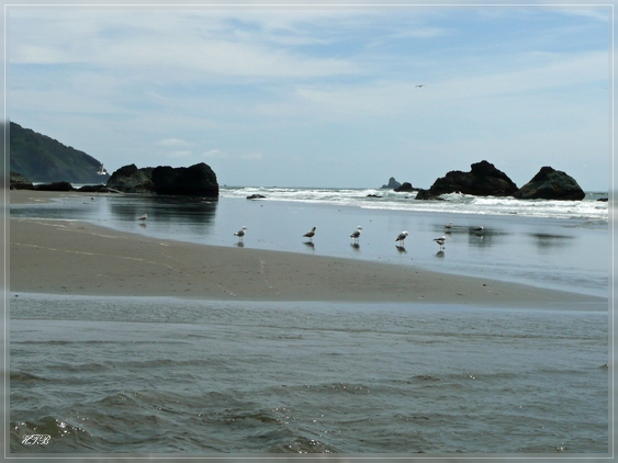 Um 13 Uhr sind wir wieder an unserem Auto. Über die historische Conde McCullough Memorial Bridge erreichen wir North Bend-Coos Bay. Hier liegen an der Küste drei State Parks direkt nebeneinander, die wir heute alle besuchen werden. Los geht es mit dem Sunset Bay State Park. Es ist gerade Ebbe und so bietet der große Sandstrand in dieser Bucht genug Platz für die Hochzeitsgesellschaft hier UND die „normalen“ Besucher. Und wir entdecken unsere Lieblingsbeschäftigung des Tages: das Absuchen der vielen Tidepools nach Seesternen, Anemonen, Krebsen und anderen Lebewesen. Und dabei vergeht die Zeit schneller als wir denken, so dass wir uns ein bisschen erschrecken als wir wieder auf die Uhr schauen.