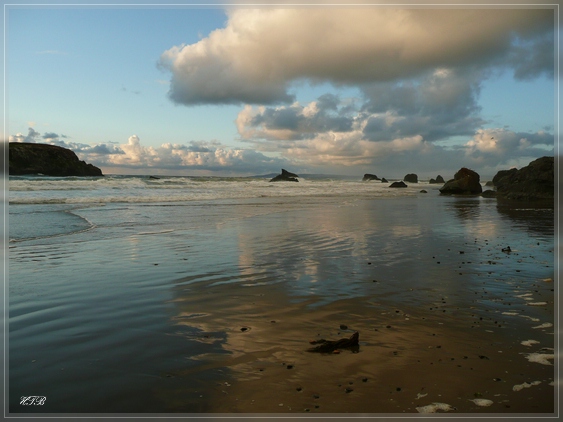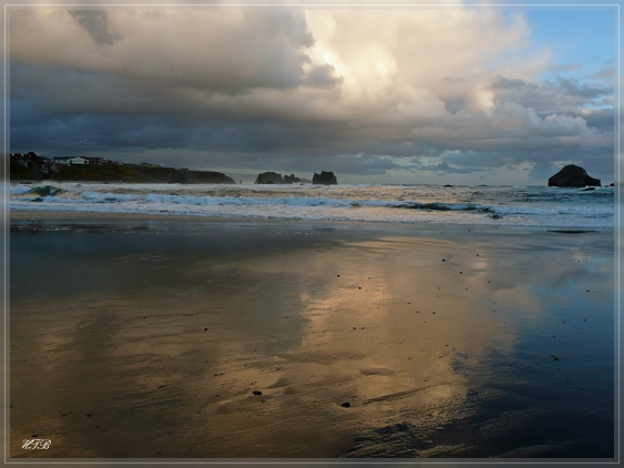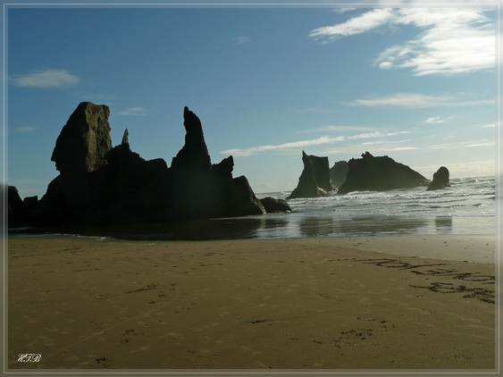 Und so ist es schon 17 Uhr als wir in Bandon Beach ankommen. Wir fahren sofort zum Coquille Point, von wo aus man den besten Blick auf die bekannten Sea Stacks und diesen herrlichen Küstenabschnitt hat. Wir laufen erst oberhalb der Klippen entlang und schießen unzählige Fotos und gehen dann hinunter zum Strand für einen ausgedehnten Spaziergang.