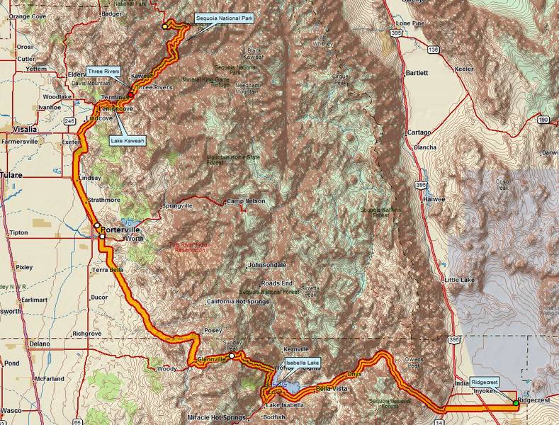 Man könnte jetzt noch mal dieselbe Strecke wie gestern über den Generals Highway durch den Sequoia NP zum Kings Canyon fahren oder aber außen herum über den HW 245. Die vielen Serpentinen und die große Baustelle, die einen ausbremsen, bringen uns zu der Entscheidung den längeren aber hoffentlich schnelleren Weg über den HW 245 zu nehmen.