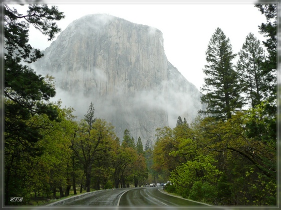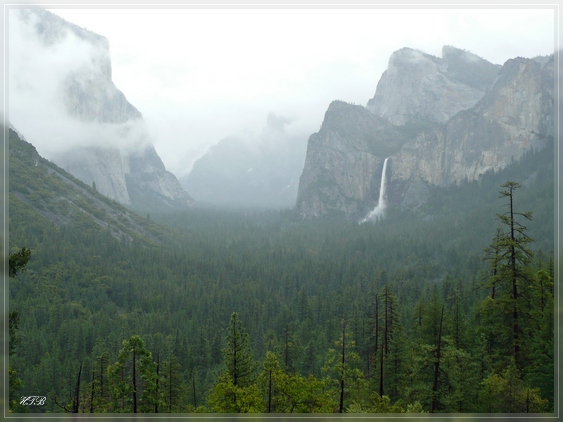 Schließlich erreichen wir bei strömendem Regen um halb vier den Yosemite South Entrance. So ein bisschen freundlicher könnte das Wetter jetzt schon sein. Der Tunnel View ist heute ohne View – man kann den El Capitan nur erahnen und den Half Dome sieht man gar nicht.