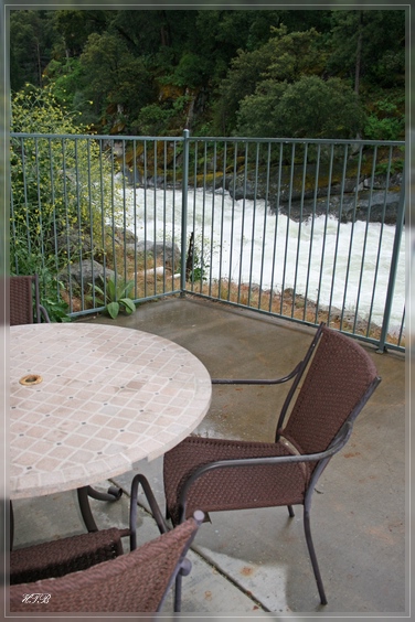 Unser Zimmer hat einen Gas-Kamin und eine riesige Terrasse direkt am Merced River, der tosend vorbeifließt. Und das Donnern und Rauschen ist auch bei geschlossenen Türen und Fenstern das dominierende Geräusch. Man kennt ja Hotelzimmer, durch die Züge oder Lastwagen fahren. Aber das gefühlt ein Fluss durchs Zimmer fließt erleben wir heute auch zum ersten Mal.