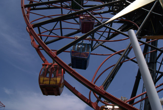 So näherten wir uns dem „See“ im Park, konnten die Achterbahn und das Riesenrad schon sehen, und nach kurzem Abstecher bei Ariel (augenroll) dem obligatorischem Kettenkarussell (2x) und einem Mittagessen war das irre Riesenrad unser Ziel. Einige Gondeln sind „traditionell“ am Rad befestigt, jede zweite allerdings läuft auf einer Schienenbahn frei und stark schaukelnd mit den Bewegungen des Riesenrades, was deutliche Schreiattacken bei manchen Passagieren verursachte, aber wohl Heidenspaß machen musste.