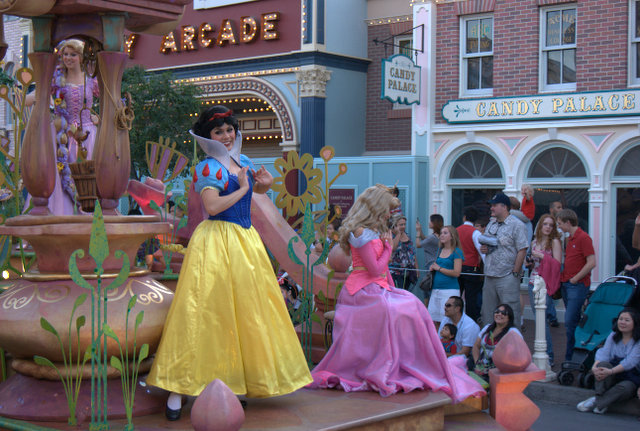 Noch etwas Monorail und so langsam sind wir Richtung Ausgang, als erneut für eine Parade gerüstet wurde. Okay, sehen wir uns die auch noch, kommt die doch aus einer anderen Richtung. Leider war es genau das gleiche Programm wie am Nachmittag aber so hatte ich Zeit zu Fotografieren, auch wenn es bereits dämmerte.
