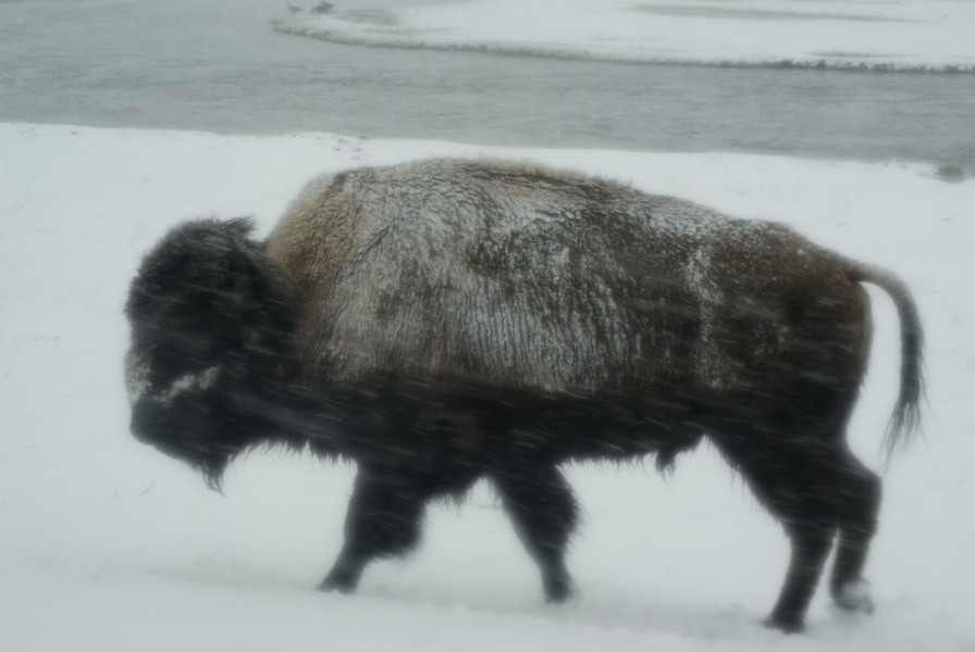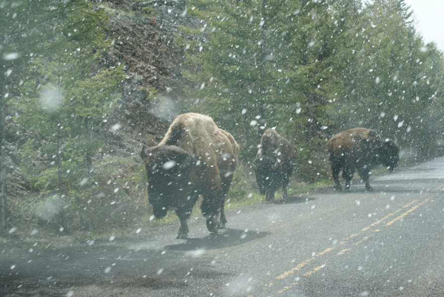 Wenig später sind wir im dicksten Schneesturm, den ich jemals gesehen habe. Auch die Bisons auf der Strasse scheinen das Wetter nicht zu mögen.