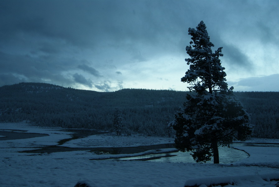 Am CG angekommen haben wir ein nettes Gespräch mit dem jungen Mann am Empfang. Er war in Pirmasens stationiert, was gerade mal 50km von unserem Wohnort entfernt liegt. Schlußendlich will er gar nicht glauben, daß wir kein Bier dabei haben. Jahaa, was können wir denn dafür, daß der Walmart in Cody keinen "Stoff" hat? Auch der Zeltplatz ist schneebedeckt... mittlerweile ist es 17:30 Uhr und bis zur Old Faithful Lodge/Snow Lodge sind es noch 16 Meilen. Wir beratschlagen, ob wir dorthin fahren mit der Gefahr, daß nix mehr frei ist und wir doch nochmal zum CG müssen und dann womöglich im Dunkeln ein Zelt aufbauen müssen. Schlußendlich sind wir ganz hart und bauen unser Zelt im Schneetreiben auf. Wie heißt es doch so schön: "nur die Harten kommen in Garten". Danach fallen mir fast die Hände ab und meine Füsse spüre ich gar nicht mehr. Kennt Ihr das Gefühl, wenn man denkt, statt Füsse solche runden Klumpen am Ende der Beine zu haben? *brrrr*