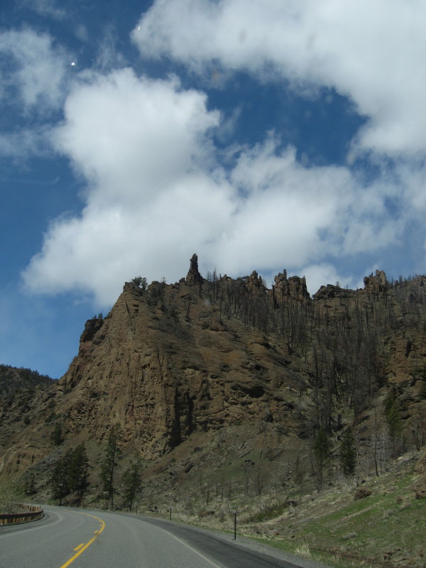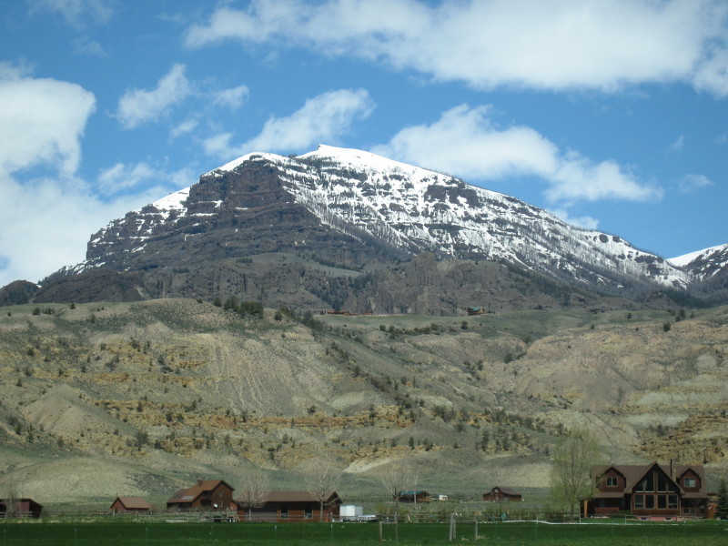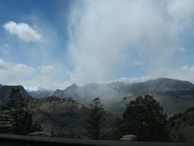 Die Landschaft ist superschön, aber je näher wir dem Yellowstone kommen, desto kälter wird es. Als es gerade noch 44°F (ca. 6°C) hat, fängt es leicht an zu schneien.. Was noch schwerer wiegt, ist die Tatsache, daß der East Entrance zwischen 10 Uhr morgens und 8 Uhr abends wegen Avalanche-Gefahr gesperrt ist. Zuerst weiß ich nicht, was die Rangerin meint, aber dann ist klar, daß es sich um Lawinen-Gefahr handelt. Die nette, ältere Dame zeigt mir auf der Karte den Umweg, den sie mit ca. 3 Stunden veranschlagt... oh Menno.. na ja, es ist 12:30 Uhr und bis abends 8 Uhr zu warten, bis hier wieder geöffnet wird, macht keinen Sinn.