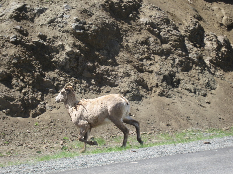 und vielen kleinen und auch größeren Blockhäusern... sehr schön. so hab ich mir Wyoming vorgestellt :-) In der Ferne sehen wir majestätische Gipfel mit Schnee bedeckt und über die Straße läuft eine kleine Ziegen-Herde. Wir kommen an einem Schild vorbei, das besagt, daß wir uns in Bären-Gebiet befinden und man dementsprechend vorsichtig sein soll. Danach wartet Patrick natürlich hinter jeder Kurve darauf, daß ein Meister Petz auftaucht..