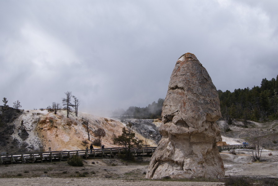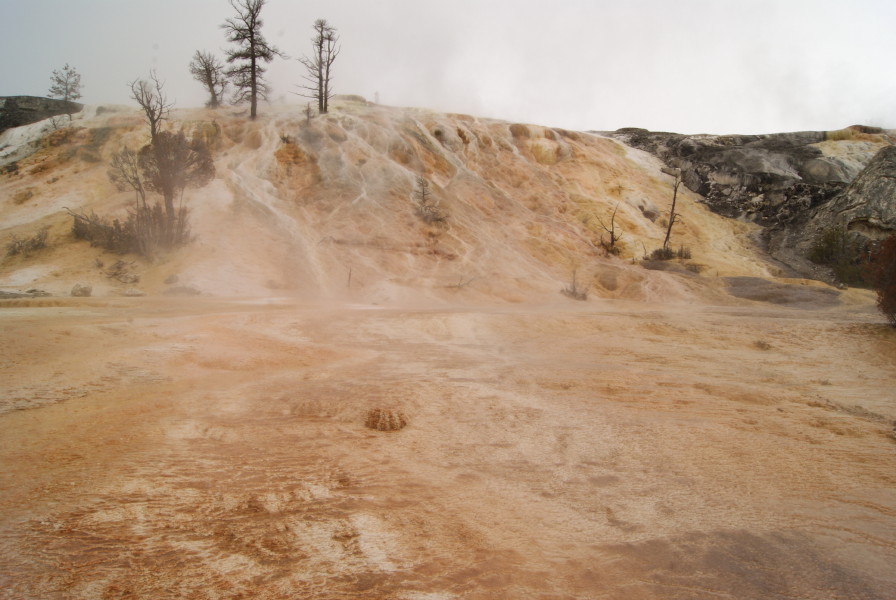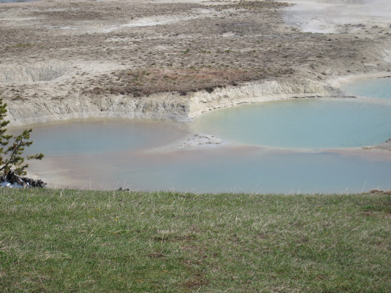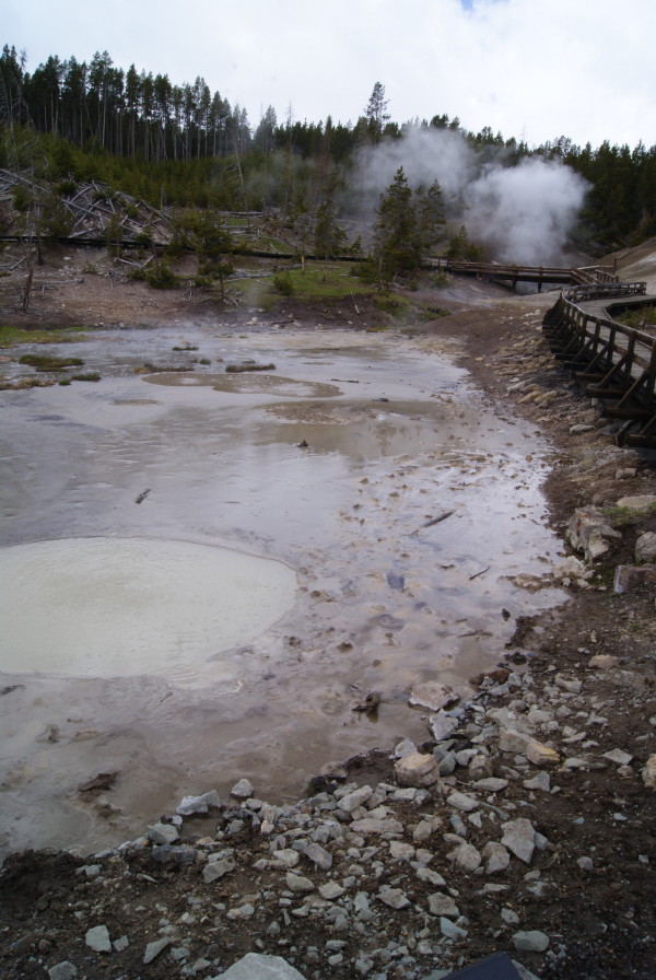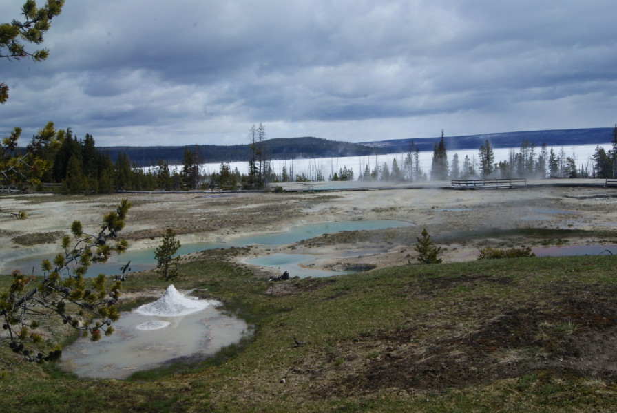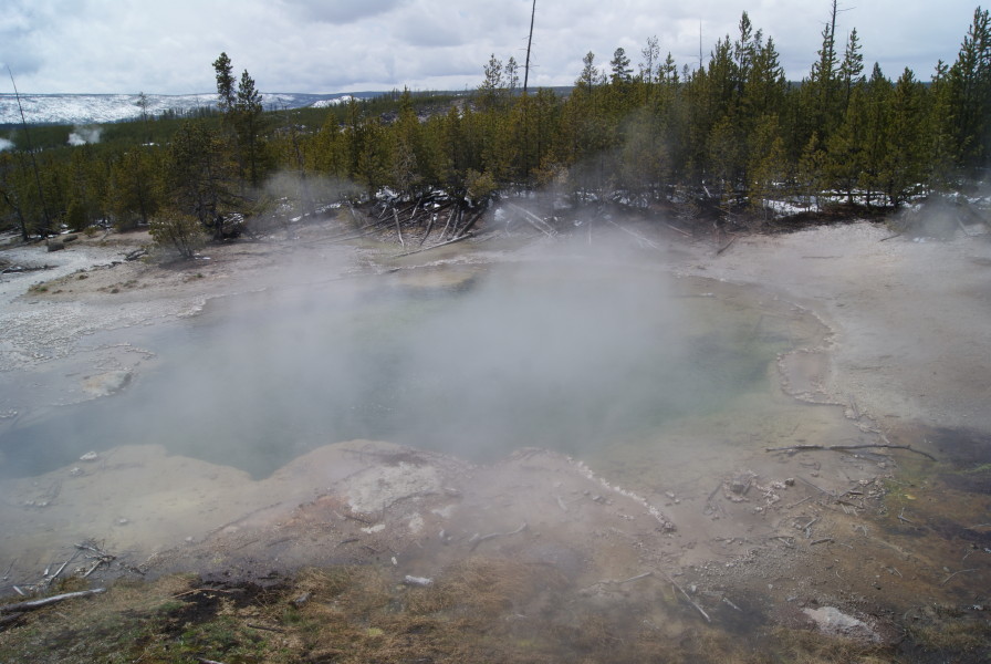 Am Norris Basin laufen wir zum Steamboat Geysir, der zuletzt im mai 2005 ausgebrochen ist. Leider will er trotz gutem Zureden heute kein heißes Wasser rausblasen. Dann eben nicht.